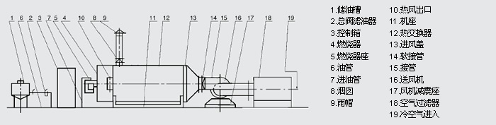 燃料通过燃烧器燃烧,产生高温燃气。并借助具有强化换热措施的热风炉将高温燃气的热量传导给被加热的空气,高温燃气经热量散发后温度降低至250℃后排到大气中。需加热的空气通过选配的鼓风机强送入热风炉、吸热后温度升值额定值从热风出口送出、当热风温度达到额定的上限温度时。燃烧器会自动停止燃烧或自动转为小火焰燃烧,当热风温度降低到额定的下限温度时,燃烧器又会重新点燃运行或转为大火燃烧,升温的速度可调进应用于金属表面涂装、制药、粮食、食品、木材加工、纺织印染、化工、汽车等行业。